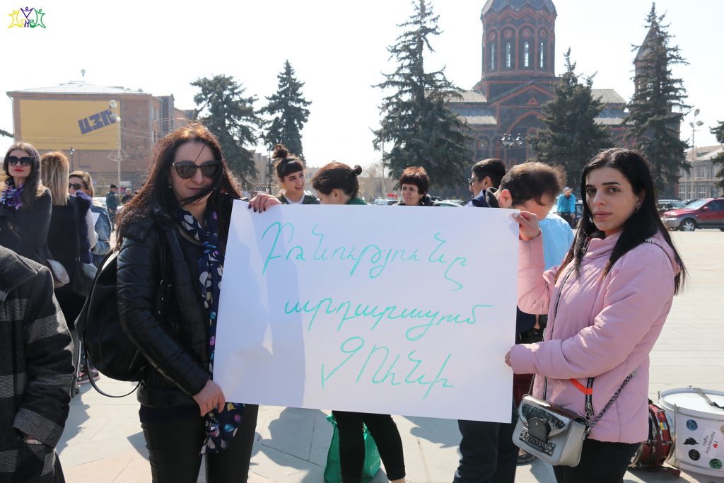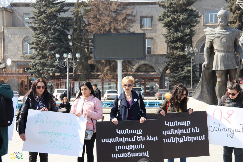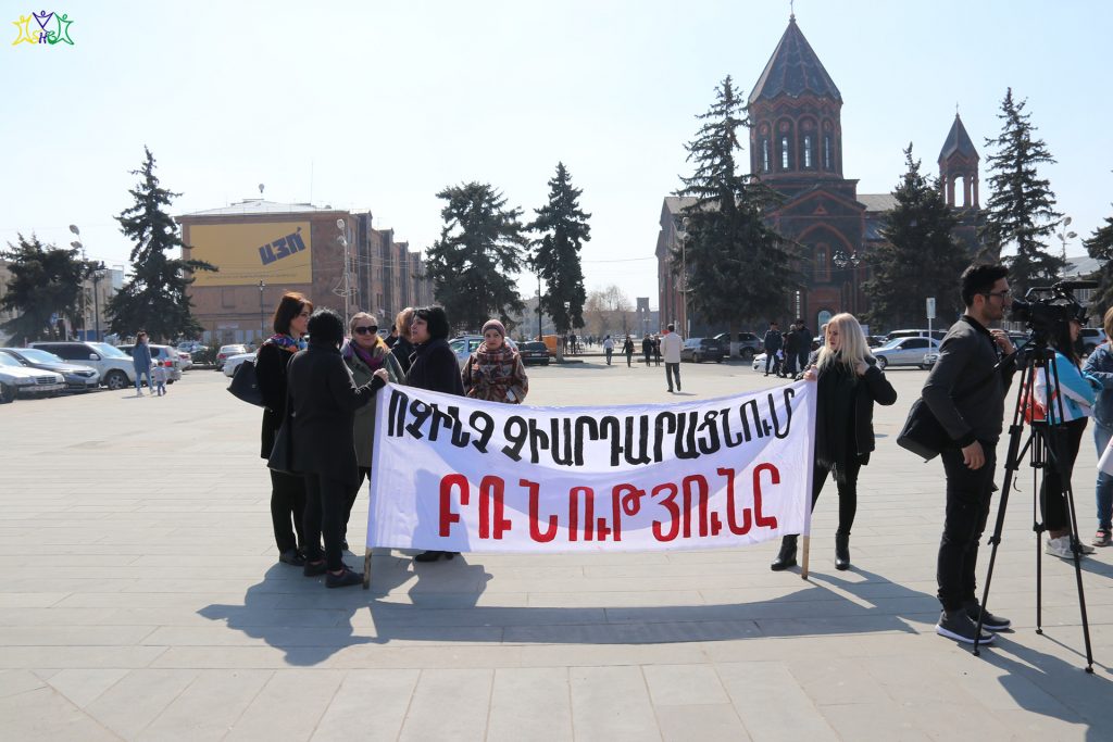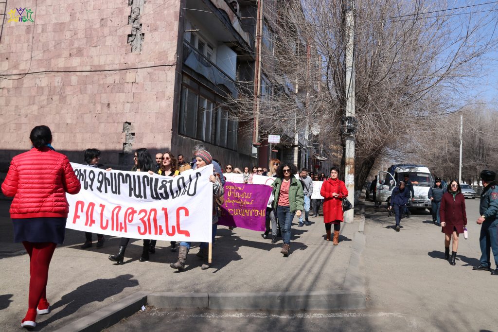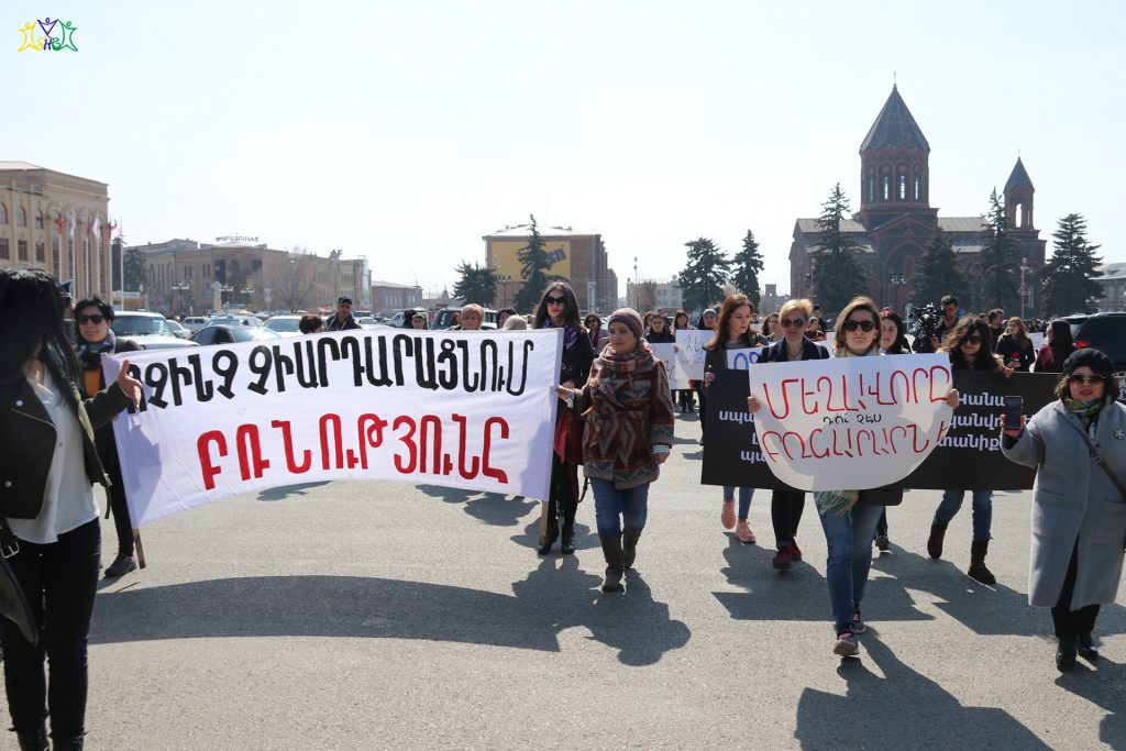On March 9, representatives of the “Spitak Helsinki Group” human rights NGO participated in a march organized by the “Coalition to Stop Violence against Women”. Coalition members and a group of activists prepared posters and marched from the central square of Gyumri to the Prosecutor’s Office, then they marched through the central streets of Gyumri to the school where the 13-year-old girl studied, to the district where the crime took place.